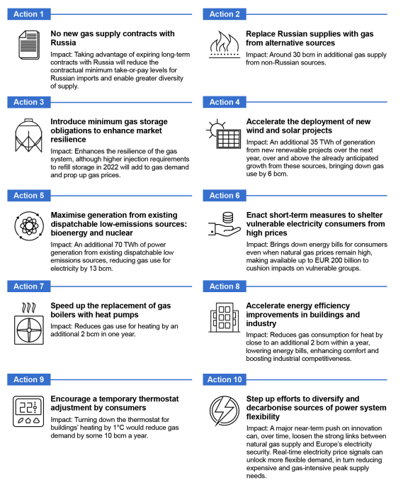 Èpossibile per l’Europa una riduzione di un terzo la sua dipendenza dal gas importato dalla Russia nel giro di un anno. Lo sostiene l’Agenzia internazionale dell’energia (Aie) in un report pubblicato oggi: lo scenario può diventare realtà applicando un ventaglio di 10 misure che vanno dall’aumento delle importazioni da altri Paesi alla diversificazioni delle fonti. Criteri già noti: ma il rapporto mette meglio a fuoco i tempi e i modi grazie ai quali il traguardo può diventare raggiungibile.