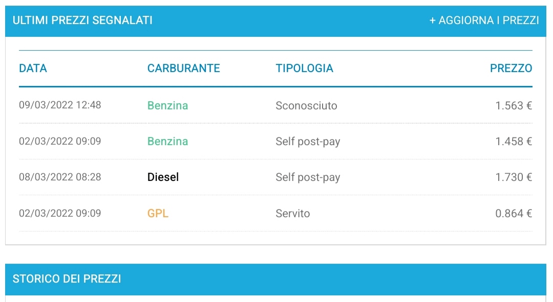 Nell’ultima rilevazione del MISE datata 7 marzo 2022, che si riferisce alla media settimanale dei prezzi dal 28 febbraio al 6 marzo, i prezzi nazionali (€/1.000 litri) della benzina, del gasolio e del gpl per l’autotrazione in modalità self-service sono i seguenti: