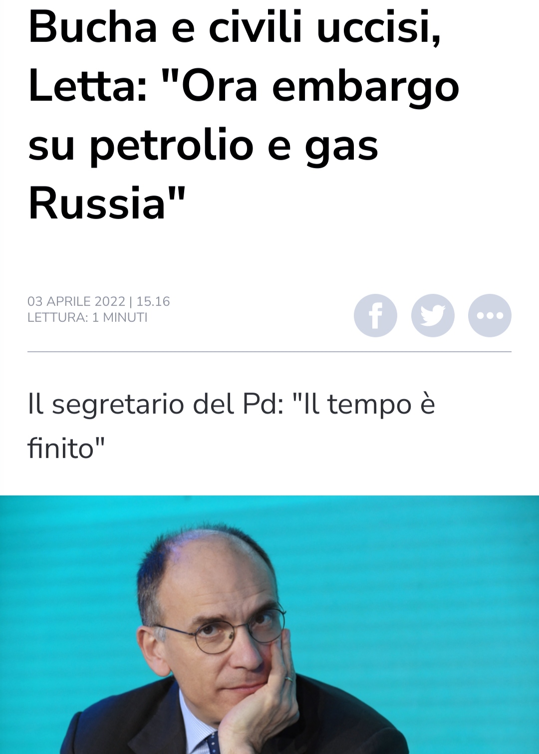 Beh, questi pare che non vedano l'ora di convincerci a farlo. Lo sanno che col gas russo produciamo anche energia elettrica? Sanno che gran parte delle aziende sarà costretta a chiudere e che si creerà un esercito di disoccupati? Lo sanno, lo sanno... Ma fanno quello che hanno sempre fatto: i f col c degli altri!