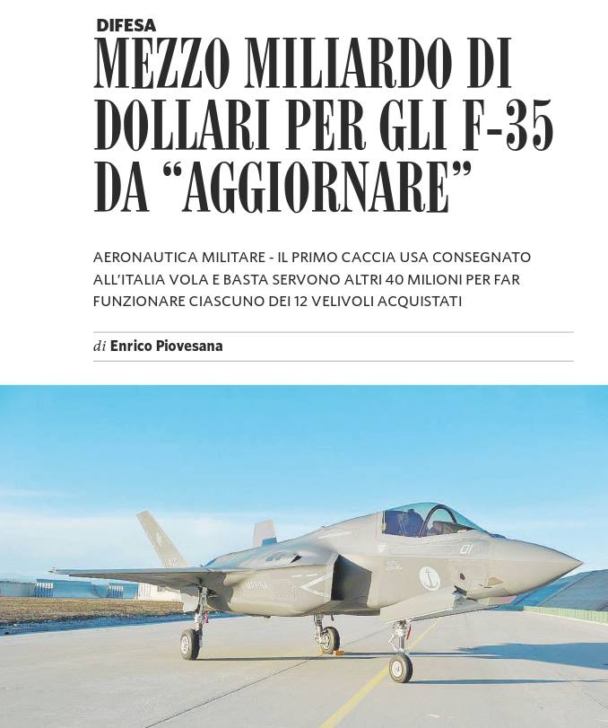 "Agli F-35 il Rapporto MIL€X dedica un approfondimento che analizza costi effettivi (50 miliardi con i costi operativi), reali ricadute industriali ed occupazionali, difetti strutturali (che rischiano di mettere fuori servizio gli F-35 finora acquistati dall’Italia per 150 milioni l’uno) e funzione strategica di questo sistema d’arma".