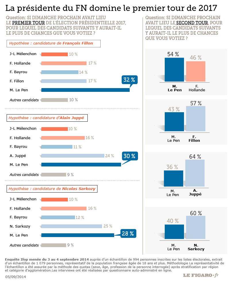 Newsweek in data 11 aprile 2014 ci fa sapere che la Le Pen col 29% ha raggiunto un consenso più che doppio dell' attuale presidente in carica, che con il 14% ha raggiunto il risultato più basso da quando l' istituto Ifop ha cominciato a raccogliere i dati sui gradimenti presidenziali nel 1958, così come è senza precedenti per un presidente in carica essere in minoranza nel suo stesso partito: meno di metà degli elettori socialisti voterebbero per lui alle prossime presidenziali.