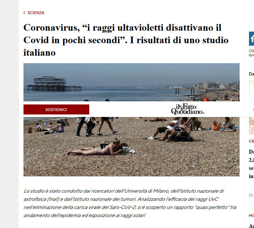 I raggi solari ci proteggono dal Covid-19. Una nuova ricerca ha dimostrato, infatti, che “il coronavirus viene disattivato dai raggi ultravioletti in pochi secondi”. Lo studio, tutto italiano, è stato condotto dai ricercatori dell’Università degli Studi di Milano, dipartimento Luigi Sacco”, dell’Istituto nazionale di astrofisica (Inaf) e dall’Istituto nazionale dei tumori. Analizzando l’efficacia dei raggi UvC nell’eliminazione della carica virale del Sars-CoV-2, si è scoperto un rapporto “quasi perfetto” tra andamento dell’epidemia ed esposizione ai raggi solari.