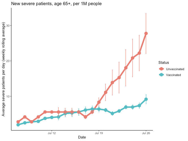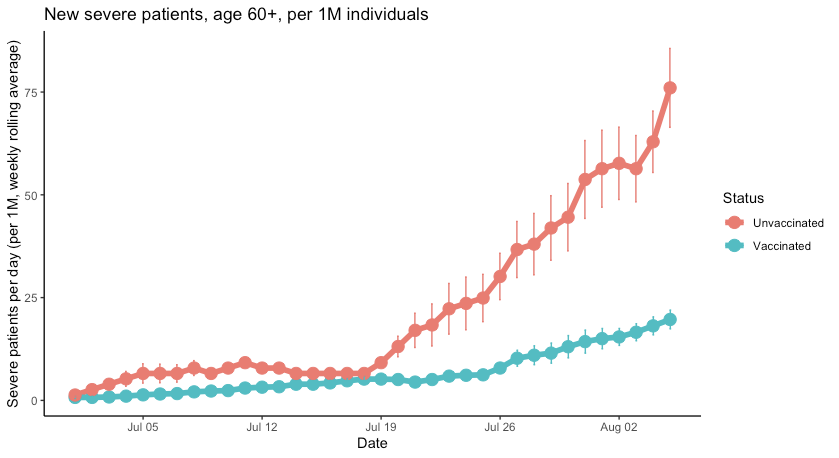 Due settimane da quando abbiamo esaminato nuovi casi gravi in ​​Israele, è tempo di verificare come sono cambiate le tendenze. Come avevamo previsto, il divario si sta allargando... Ora 20 per 1 milione di nuovi casi gravi nel gruppo dei vaccinati contro 79 nei non vaccinati (VE ~= 80%). Come sarà tra due settimane?