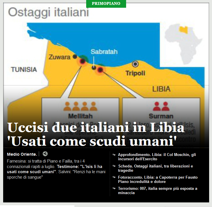 Il rientro in Italia degli ostaggi italiani. La guerra è in realtà un regolamento di conti e una spartizione della torta tra gli attori esterni e i due poli libici principali, Tripoli e Tobruk, che hanno due canali paralleli e concorrenti per l’export di petrolio.