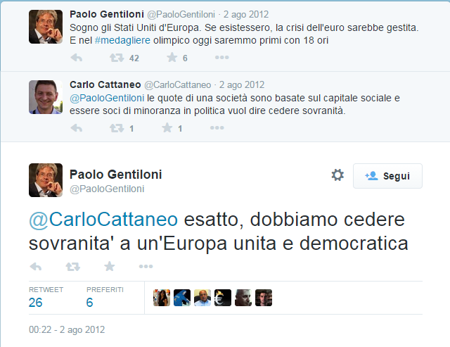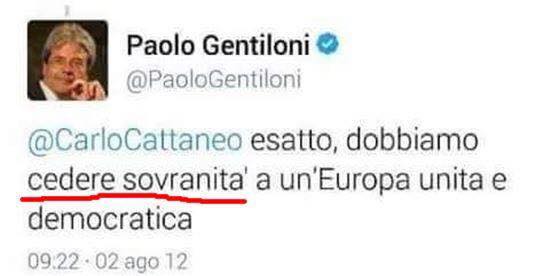 La scelta del nuovo Presidente del Consiglio è ricaduta su uno dei più stomachevoli servi di Bruxelles, Paolo Gentiloni, già agli Esteri, e convinto sostenitore delle cessioni di sovranità nazionale, fatto che ribadiamolo per l’ennesima volta, costituisce reato, trattasi di delitto contro la personalità dello Stato (artt. 241 e 243 cp).
