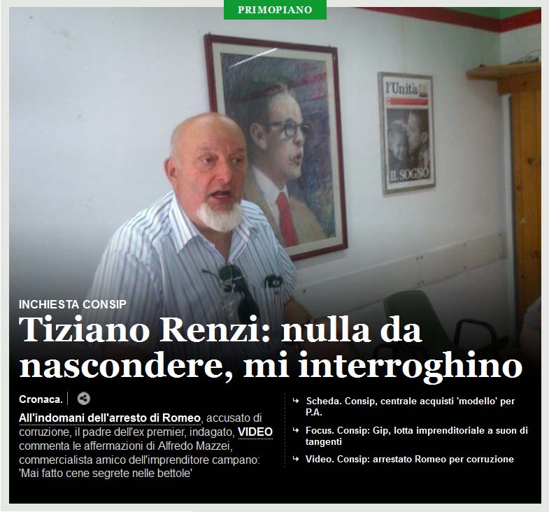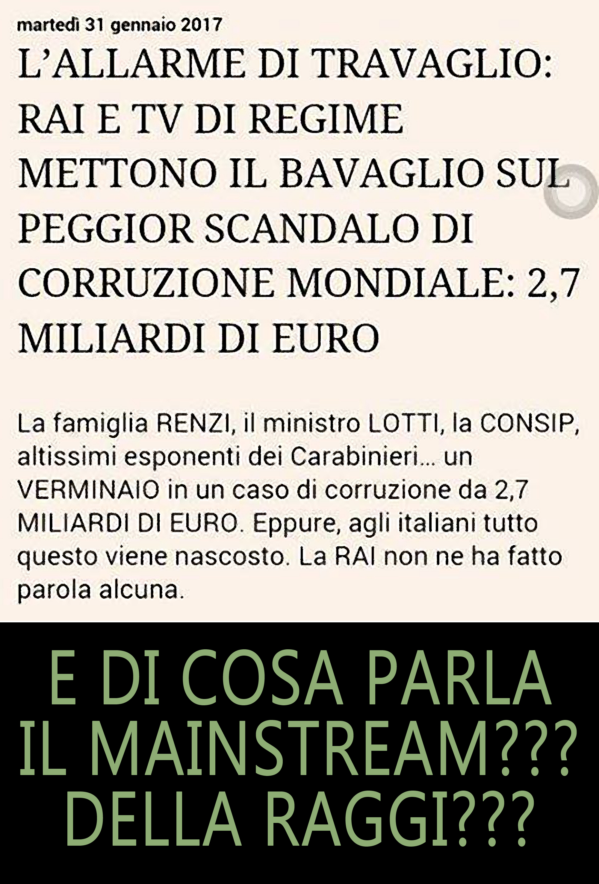 La famiglia RENZI, il ministro LOTTI, la CONSIP, altissimi esponenti dei Carabinieri… un VERMINAIO in un caso di corruzione da 2,7 MILIARDI DI EURO. Eppure, agli italiani tutto questo viene nascosto. La RAI non ne ha fatto parola alcuna. “Chi s’informa (si fa per dire) dai tg Rai, cioè la stragrande maggioranza degli italiani, non sa quasi nulla dell’indagine della Procura di Napoli che vede indagati Luca Lotti (il ministro più vicino a Renzi) e i generali Tullio Del Sette (comandante generale dei Carabinieri) ed Emanuele Saltalamacchia (capo dell’Arma in Toscana) per la soffiata che ha vanificato le intercettazioni alla Consip a proposito di un appalto in odor di tangenti destinato all’imprenditore Alfredo Romeo, napoletano, grazie ai buoni uffici di Carlo Russo, fiorentino di Scandicci intimo della famiglia Renzi.