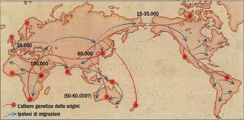 La teoria più largamente accettata sulle origini dell’uomo moderno – nota come “Fuori dall’Africa” (out of Africa; la teoria alternativa si chiama “multiregionale“) – sostiene che gli antenati dell’Homo sapiens si originarono in Africa circa 200000 anni fa. Un gruppo relativamente piccolo di persone lasciò poi il continente per popolare il resto del mondo tra i 50000 e i 60000 anni fa, rimpiazzando gli uomini più primitivi.