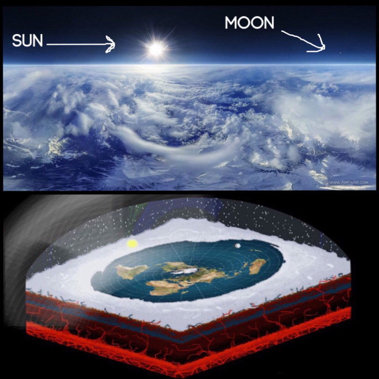 ...the earth is an enclosed plane, centered at the North Pole and bounded along its outward edge by a wall of ice, with the sun, moon, planets, and stars only a few hundred miles above the surface of the earth.