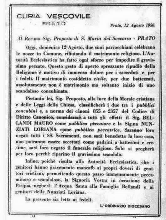 "Pertanto lei, signor Proposto, alla luce della morale cristiana e delle leggi della Chiesa, classificherà i due tra i pubblici concubini e, a norma dei canoni 855 e 2357 del Codice di Diritto canonico, considererà a tutti gli effetti il signor Bellandi Mauro come pubblico peccatore e la signorina Nunziati Loriana come pubblica peccatrice. Saranno loro negati tutti i SS. Sacramenti, non sarà benedetta la loro casa, non potranno essere accettati come padrini a battesimi e cresime, sarà loro negato il funerale religioso. Solo si pregherà per loro perché riparino il gravissimo scandalo". Una messa al bando dalla comunità cristiana in piena regola. Ed infine, perché la condanna risultasse più forte e totale, la lettera del vescovo terminava con queste incredibili parole che sembravano riesumate dai secoli più bui del Medio Evo: "Infine, poiché risulta all' Autorità ecclesiastica che i genitori hanno gravemente mancato ai propri doveri di genitori cristiani, permettendo questo passo immensamente peccaminoso e scandaloso, la Signoria Vostra, in occasione della Pasqua, negherà l' Acqua Santa alla famiglia Bellandi e ai genitori della Nunziati Loriana. La presente sia letta ai fedeli".