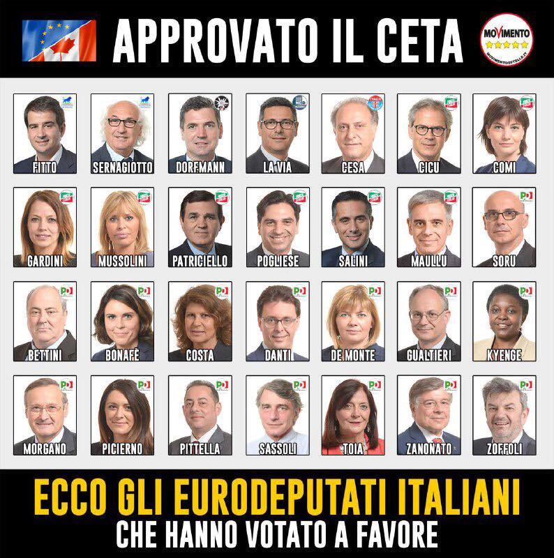Come si dice, fatta la legge trovato l'inganno. La gente non ha capito che il Ceta è semplicemente un Ttip mascherato poiché in Canada sono attive moltissime multinazionali Usa quindi usano solo la porta di servizio per mettercelo a quel servizio infatti il Ceta consente l ingresso di Ogm e pesticidi attualmente vietati, l'importazione di prodotti derivati da animali trattati con ormoni della crescita, l'importazione di grano canadese fatto col glifosato (un noto cancerogeno quindi pensiamo a tutta la pasta, il pane e i farinacei che mangiamo che già non sono prodotti con grano italiano).
