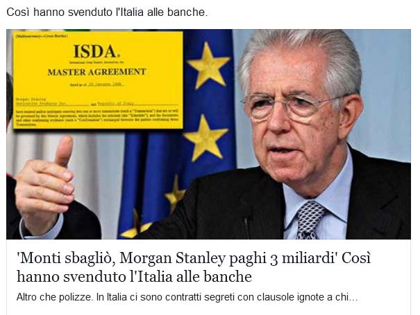 La procura della Corte dei Conti intima a Morgan Stanley di restituire 2,9 miliardi all’ Italia. Quelli utilizzati da Mario Monti, all’ epoca dei fatti capo del governo, per chiudere un derivato acceso dalla banca d’ affari Usa a copertura del debito pubblico italiano.