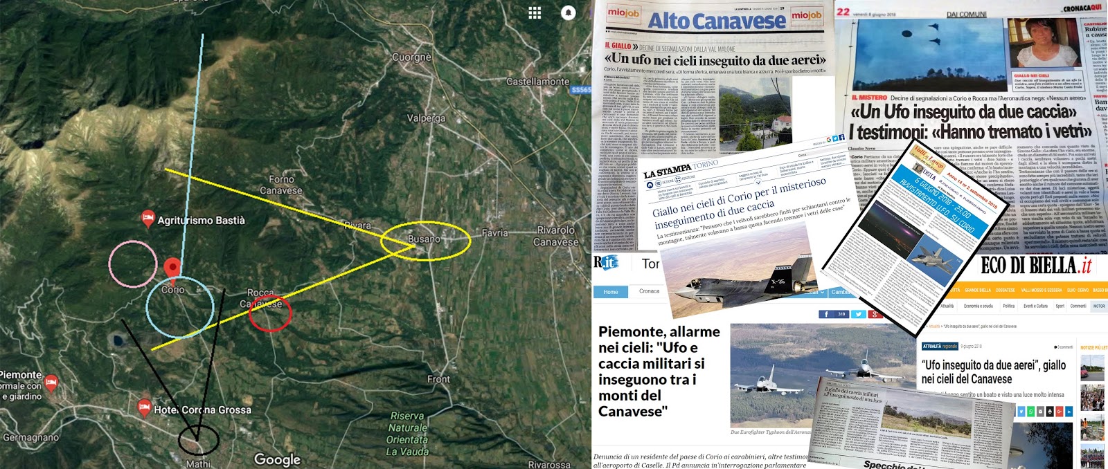 UFO su Corio Canavese 6/6/2018Di solito, quando si verificano eventi ufologici di una certa importanza, i testimoni inviano le loro testimonianze e il loro eventuale materiale fotografico, il più delle volte invitandomi a non rendere pubblica la loro persona. In questo caso è avvenuto esattamente l’opposto: un alto numero di testimoni disposti a metterci la faccia e il nome, ma niente materiale fotografico a sostegno, almeno per il momento. Pertanto tutte le foto a soggetto ufologico presenti in questo articolo, sono materiale relativo ad altri casi, così come sarà specificato.