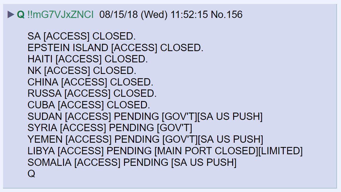 Una volta completato il processo di trasferimento, possiamo aspettarci che alcune delle accuse sigillate vengano rivelate pubblicamente, e Trump dichiara pubblicamente la vittoria nel suo tentativo di "bonificare la palude". Possiamo aspettarci un sacco di pensionamenti inaspettati da parte di individui accusati che stanno attualmente facendo patteggiamenti per sfuggire alla reclusione. Le persone coinvolte negli abusi dei diritti umani più eclatanti, come la tratta di bambini, saranno molto probabilmente esposte pubblicamente e provate.