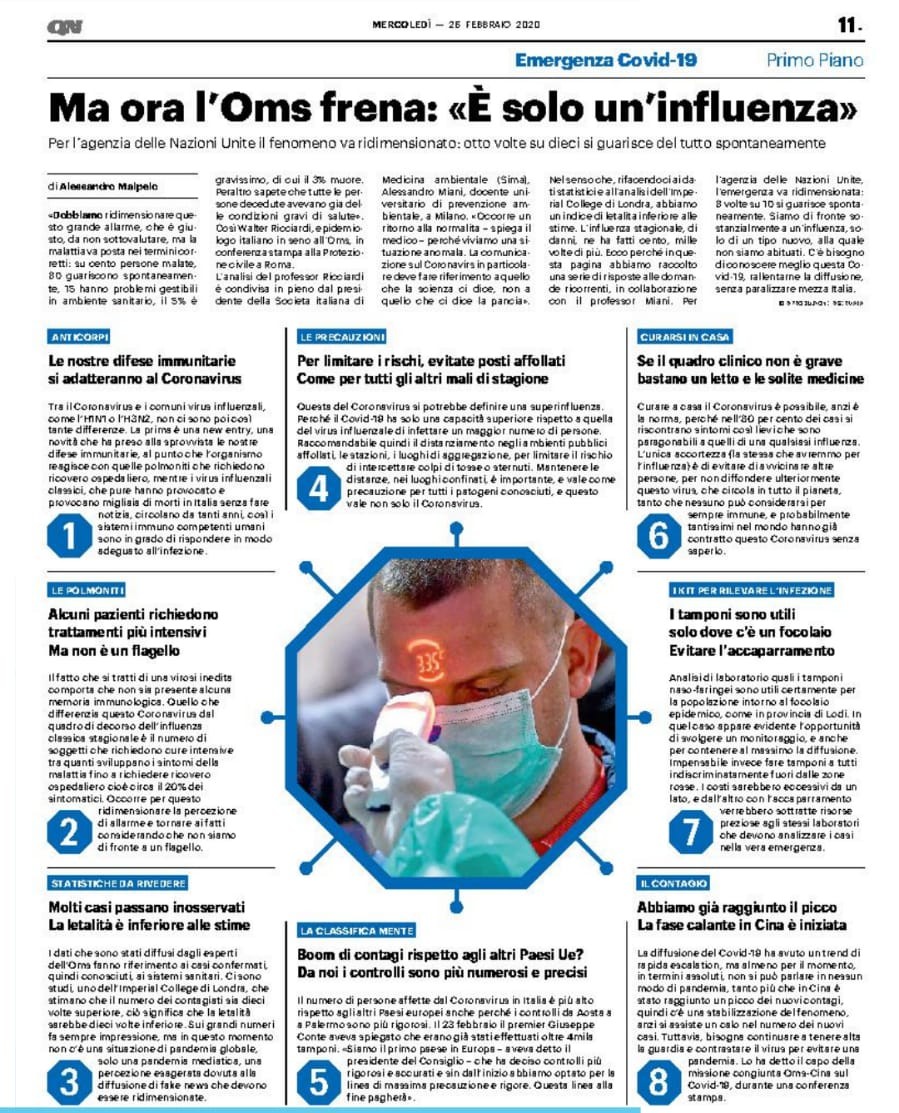 Insomma i contagi sarebbero due: uno pandemico a diffusione lenta attraverso i viaggi degli infettati, e l’altro locale. Quest’ultimo poco più che un virus para-influenzale, di nessuna nocività mortale se non per la solita parte “a rischio” della popolazione.