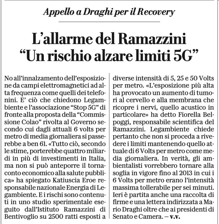 Esattamente come ordinò Vittorio Colao al Governo Conte lo scorso anno. Adesso che nell’esecutivo Draghi è diventato ministro, il top manager delle multinazionali del 5G avrà di certo benedetto col massimo dei favori la Proposta di Piano nazionale di ripresa e resilienza appena approvata dalla IX Commissione (Trasporti, poste, telecomunicazioni) della Camera dei Deputati: innalzare l’elettrosmog fino a 61 V/m, cioé al massimo finora consentito nel mondo senza uno straccio di prova scientifica sugli effetti sanitari. “si valuti l’opportunità di adeguare gli attuali limiti italiani sulle emissioni elettromagnetiche a quelli europei“, si legge nel testo licenziato da Montecitorio, dando pieno sostegno alle Telco che, se mai un dubbio ce ne fosse stato, troveranno spianata la strada in Parlamento, come auspicato dal tandem Draghi-Colao.