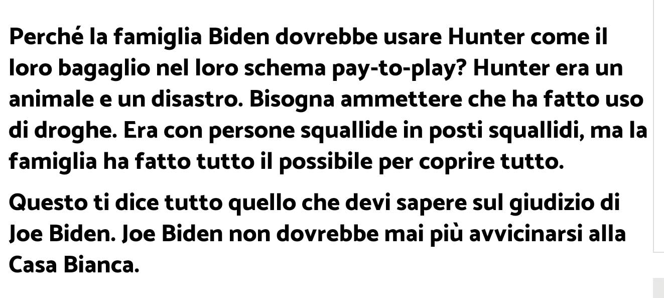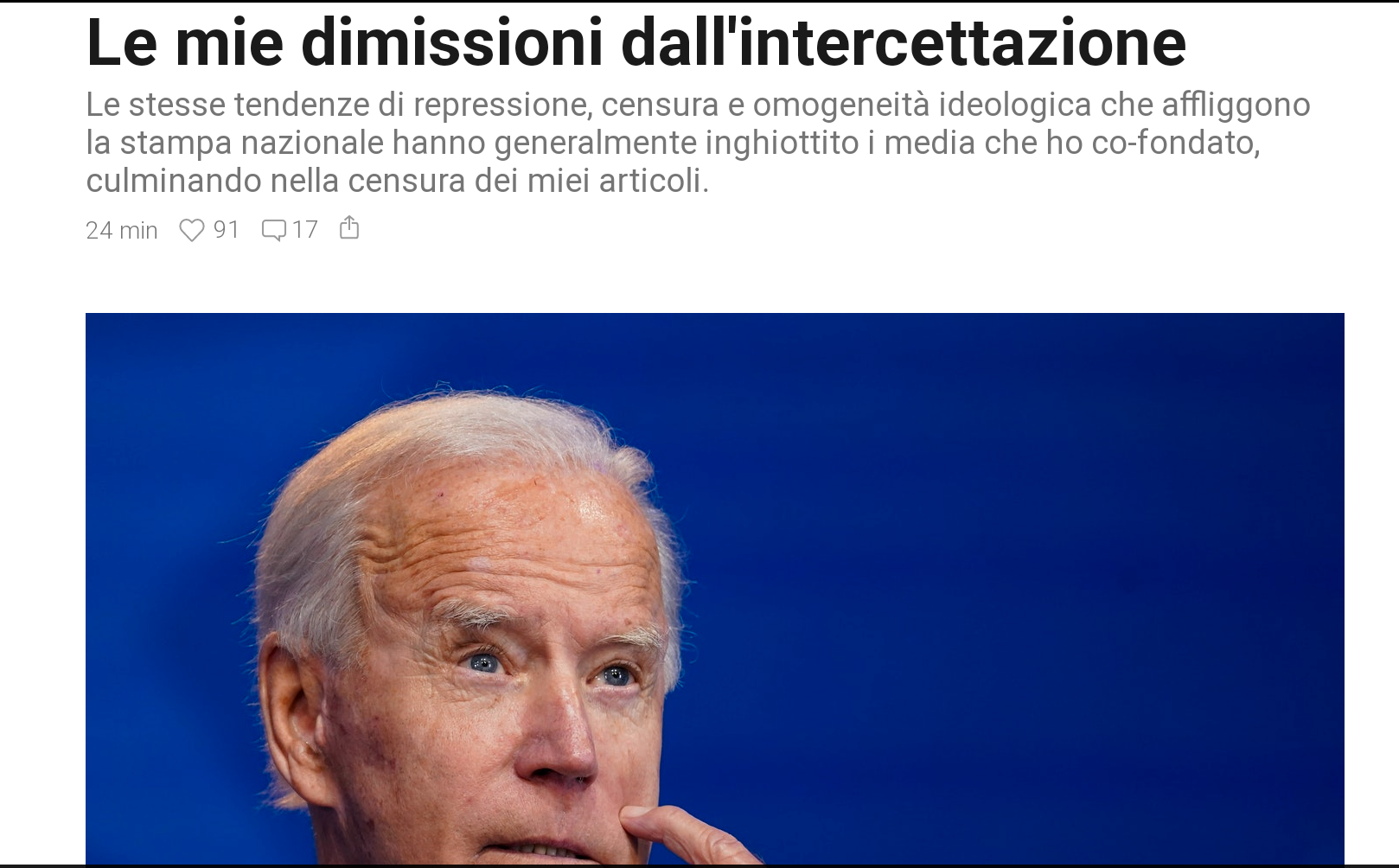 Dire che una tale censura è una linea rossa per me, una situazione che non accetterei mai a prescindere dal costo, è un eufemismo. È sorprendente per me, ma anche un riflesso del nostro discorso attuale e dell'ambiente illiberale dei media, essere stato messo a tacere su Joe Biden dal mio stesso media.