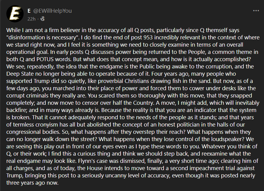 È in atto un'azione militare globale che sarà biblica. OGNI Ordine Esecutivo di Trump ha supportato questa azione. Oggi il deep state ha giocato una carta di facciata, e ha fatto credere all'America e, sì, anche a molti di noi, di aver vinto la partita... ma, avete notato che... Trump non ha ancora fatto NULLA di eclatante?