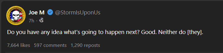 Tenete a mente lo scopo e la grandezza di quello che c'è in gioco. Parliamo del controllo dell'intero pianeta e, letteralmente, del futuro della nostra intera specie. Tutto questo è molto più grande della nostra Guerra Civile o della Guerra Rivoluzionaria, più grande anche della Seconda Guerra Mondiale. Come sapete, il deep state dispone di armi atomiche e farete meglio a credere che le useranno prima di lasciarsi mettere in galera e/o confiscare le ricchezze.
