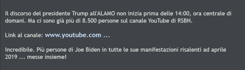 Davvero pensavate che Dorsey, Zuckerberg [i CEO di Twitter e Facebook, rispettivamente, n.d.r.] e gli altri avrebbero lasciato pubblicare la verità, assicurando a loro stessi una perdita di potere che sarebbe stata sostituita dalla cella di un carcere?