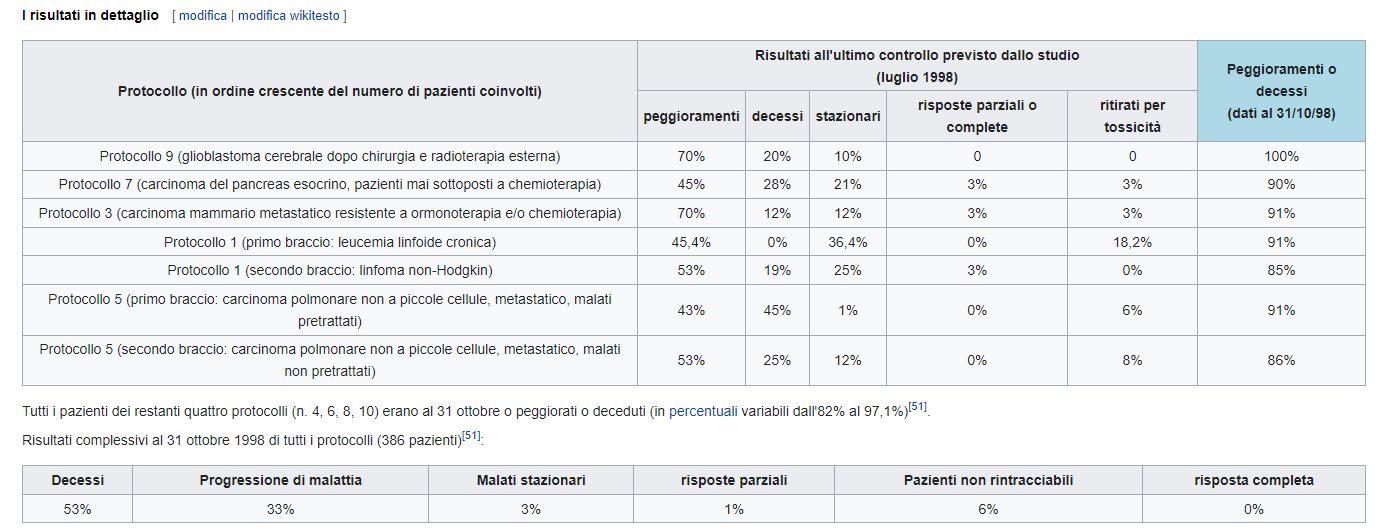 «i 3 casi di risposta parziale osservati tra i 386 pazienti rappresentano un tasso di risposta dello 0,8% che è ben al di sotto di ogni soglia ragionevole per dichiarare che un nuovo trattamento mostra un'attività promettente. Il basso tasso di risposta consente di escludere la possibilità che il trattamento, preso nel suo complesso, abbia alcun effetto oltre la moderata attività che è già stata dimostrata per alcuni suoi componenti»