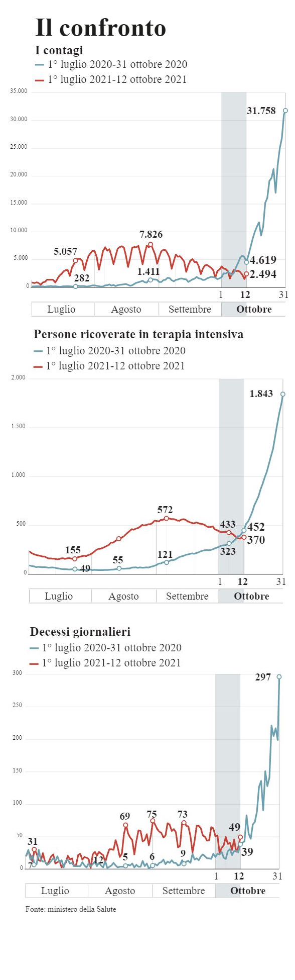 Ieri, 12 ottobre, 2.494 casi e 49 morti. L’anno scorso oltre il doppio dei casi, quasi lo stesso numero dei morti (41), ma perché la dinamica dei decessi ha uno scostamento temporale di tre-quattro settimane rispetto al momento del contagio. Il tasso di positività dei tamponi molecolari era al 5,21%, quello attuale al 3,10% (nel calcolo ora ci sono anche gli antigenici che un anno fa non venivano contabilizzati). Soprattutto stava decollando verso l’alto la curva-chiave: i posti letto occupati in terapia intensiva (514 il 13 ottobre 2020, ieri erano 370) uno dei parametri decisivi per le misure di contenimento perché misura la sofferenza del sistema sanitario.