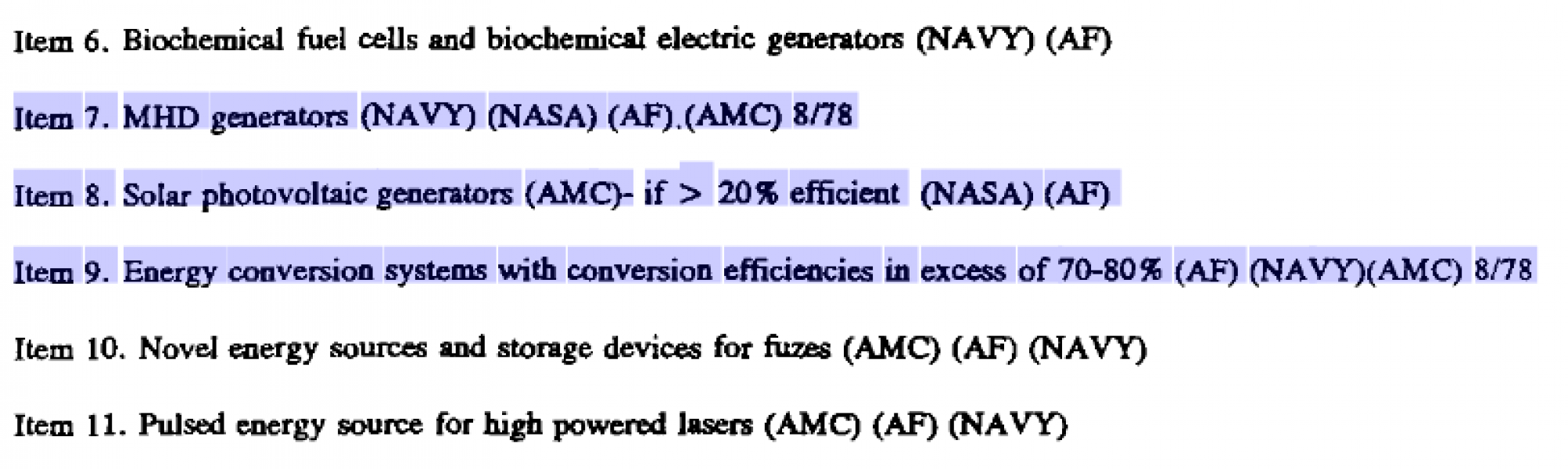 Grazie a Steven Aftergood, direttore della Federazione degli scienziati americani, sappiamo, ad esempio, che dal 1971 (5) i generatori fotovoltaici sono stati oggetto di restrizione o blocco brevettuale se l'efficienza superava il 20%, come anche tutti i sistemi di conversione energetica che superavano la soglia dell 70-80%.
